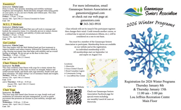The Gananoque Seniors Association’s Registration for 2026 Winter Programs will be Thursday January 8th & Thursday January 15th from: 11:00 am – 3:00 pm at Lou Jeffries Recreation Centre on the main floor.